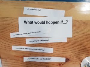The solutions are usually absurd and that’s what makes those exercises so much fun. Our team’s answers for “What would happen if every day was a Wednesday?” ranged from more obvious ones, like “There would be no more Monday holidays”, and “Camels would roam around free” to crazier ones, like “People would finally learn how to spell Wednesday”, and “We would meet our billable time goal each week”.